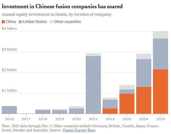 On the other side of the world, China’s government has made fusion a national priority, marshaling resources at daunting speed. Recently, a Shanghai start-up essentially matched an engineering breakthrough by America’s best-funded fusion company, Commonwealth Fusion Systems, in much less time. Over the summer, the Chinese government and private investors poured $2.1 billion into a new state-owned fusion company. That investment alone is two and a half times the U.S. Energy Department’s annual fusion budget.